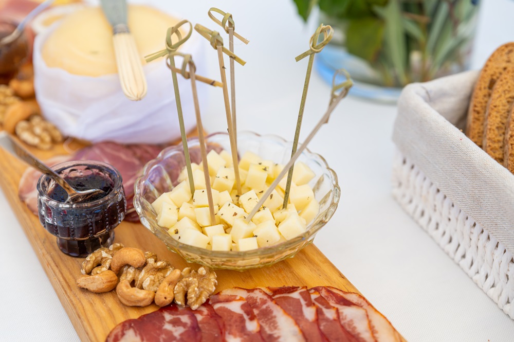 Azeite Extra Virgem do Douro com Vinagre Balsâmico de Vinho do Porto, Azeitonas Negrinha do Freixo e Cebolinhas Temperadas, Pão tradicional de padaria local e Tostas Tábua de Queijos e Enchidos, Bola ‘Handmade’ Pipadouro, Salmão fumado, Covilhetes, Fruta da Época Vinho Branco – Quinta do Crasto ou Quinta do Cidrô Alvarinho Serviço de Águas, Café e Chá