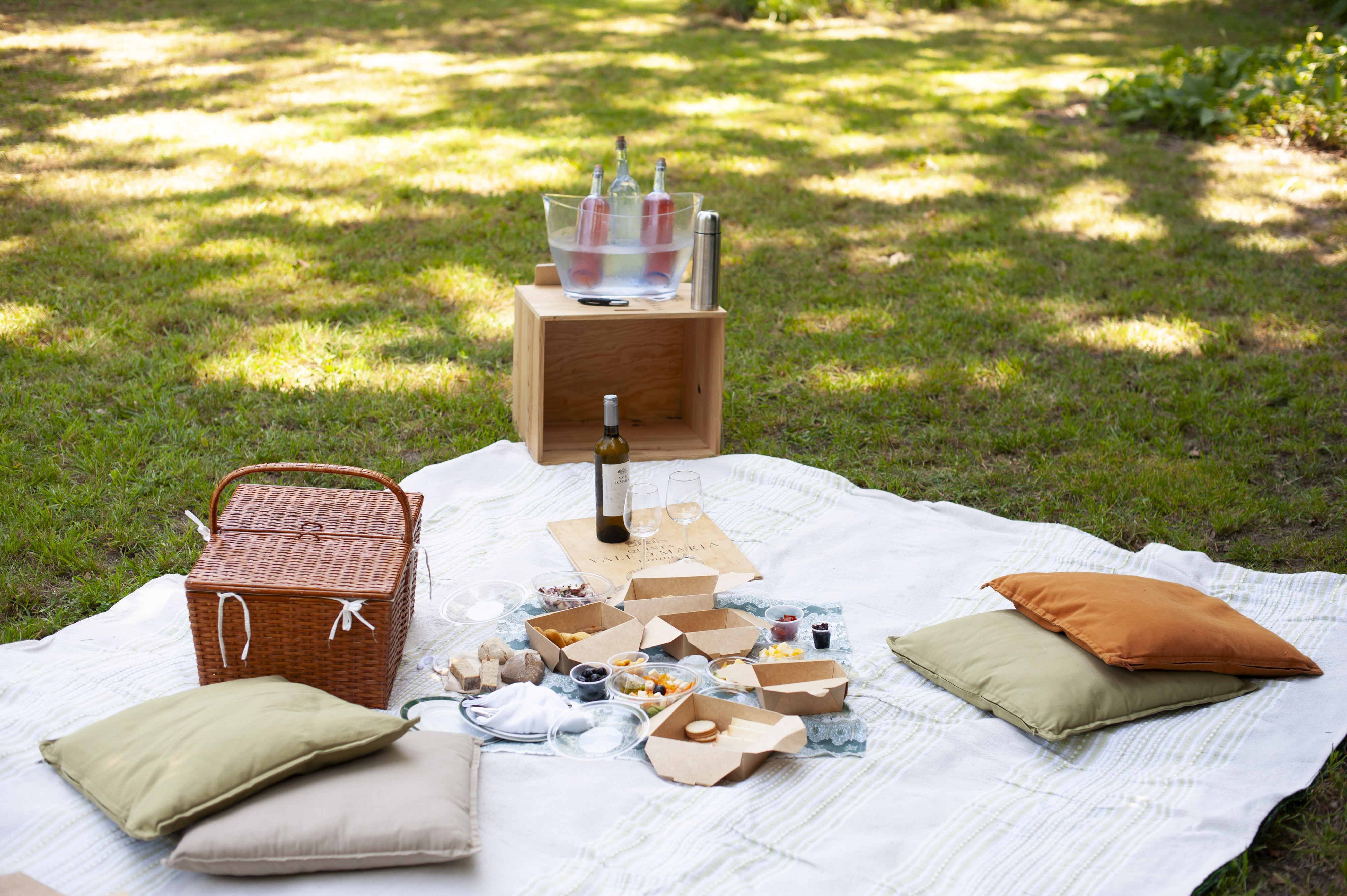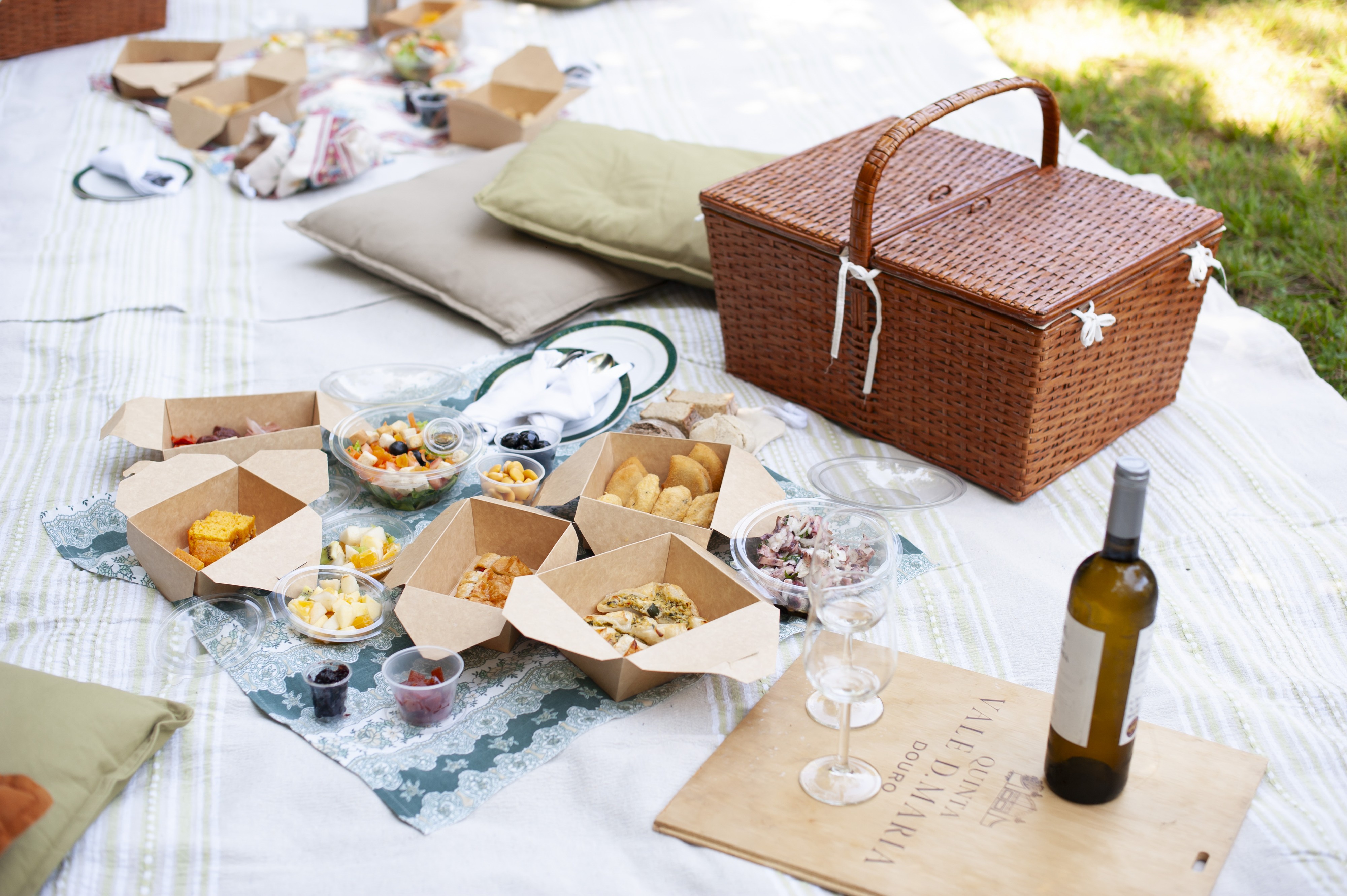 O cesto inclui: sumo da Quinta, água, Vale D. Maria Vinhas do Sabor branco ou tinto, seleção de pães, tremoços ao sal, azeitonas aromatizadas, hummus de grão de bico, compota Aveleda, marmelada Aveleda, bola de carne, seleção de enchidos, seleção de queijos Aveleda, seleção de salgadinhos, salada de massa da Quinta, mini quiche de legumes, folhado de cogumelos e tomate, rolo de salmão com espinafres, bolo caseiro, salada de fruta.